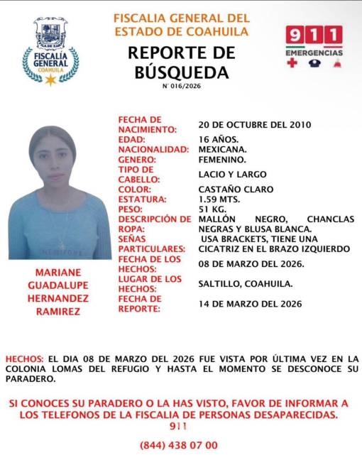 Autoridades y familiares solicitan el apoyo de la ciudadanía para localizar a Mariane Guadalupe Hernández Ramírez, una adolescente de 16 años de edad que fue reportada como desaparecida en la ciudad de Saltillo.