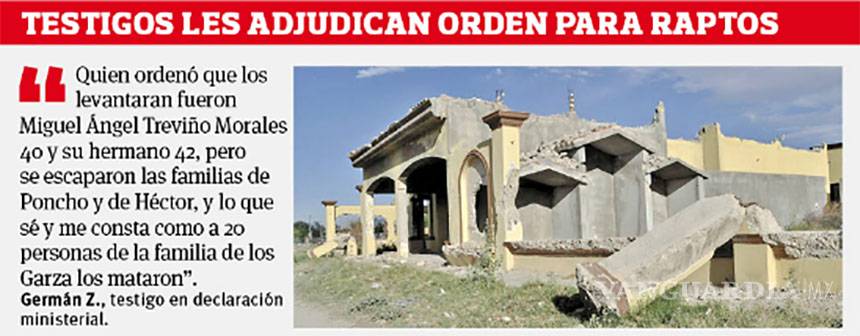 “Yo era RT de puntos para los Zetas y yo estuve presente en estos hechos, pero yo no participé en la privación de la libertad ni muerte de esas personas (…) según escuché que habían robado cinco millones de dólares a los zetas Poncho Cuéllar, Wicho Garza y Héctor Moreno, y quien ordenó que los levantaran fueron Miguel Ángel Treviño Morales 40 y su hermano 42, pero se escaparon las familias de Poncho y de Héctor, y lo que sé y me consta como a 20 personas de la familia de los Garza los mataron y los quemaron en un rancho Tres Hermanos en Zaragoza”, aseguró Germán Z. ante la justicia local.
