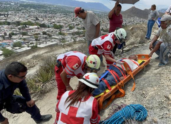 Un hombre fue rescatado en camilla y con canastilla por elementos del cuerpo de paramédicos de la Cruz Roja de Saltillo, con el apoyo de vecinos y policías municipales, luego de desvanecerse en lo alto del Cerro del Pueblo la tarde de este jueves.