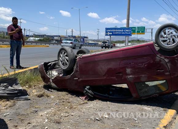 SALTILLO, COAH.- Al tener una distracción al volante y no decidir por donde irse, si por los carriles centrales o laterales, el conductor de un vehículo se fue en medio de la división y terminó por volcarse sobre el camellón terminando su auto con los neumáticos hacia el cielo.