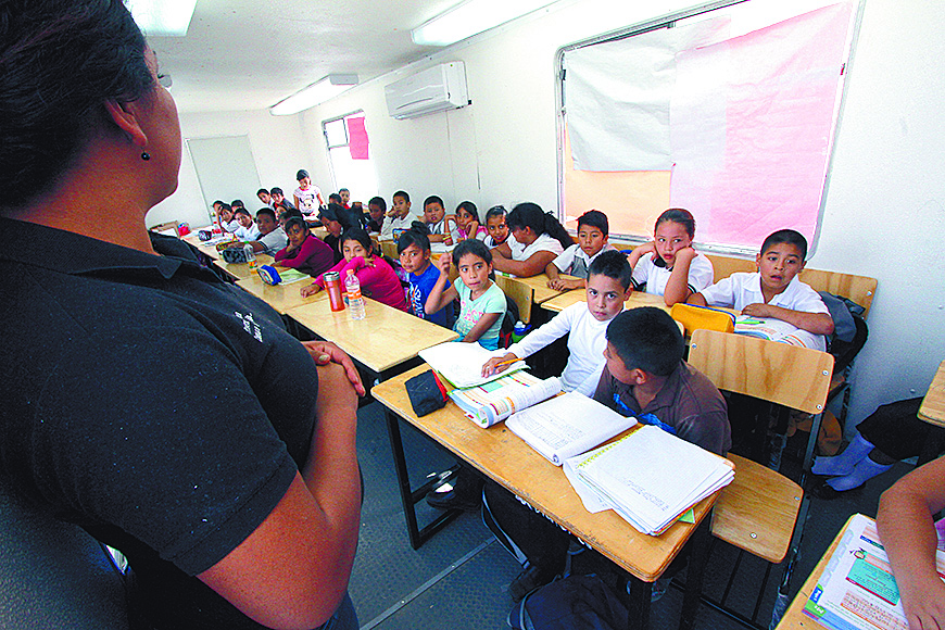 Amontonados y en aulas moviles, así estudian niños de primaria en Saltillo