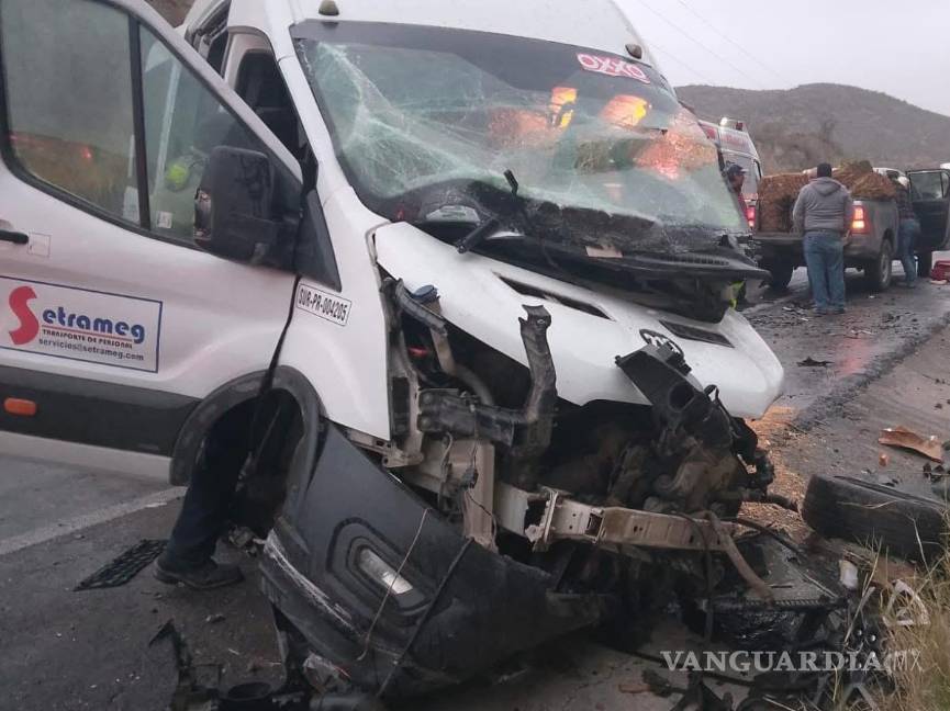 El aparatoso accidente ocurrió alrededor de las 6 de la tarde de este jueves en la carretera a Monclova, a la altura del kilómetro 18, cuando el conductor de una unidad de transporte de personal invadió el carril contrario a su circulación para rebasar un tráiler.