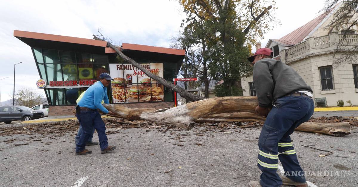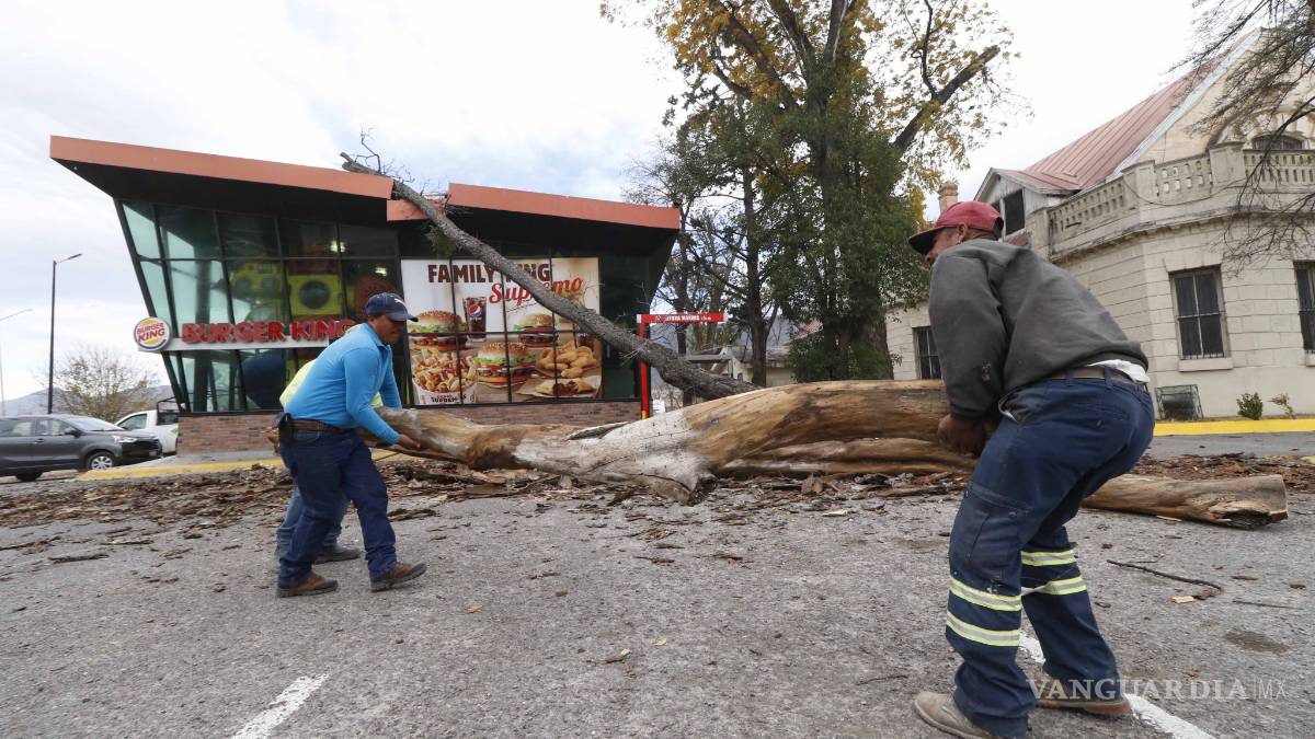 Los fuertes vientos que azotaron la capital coahuilense provocaron que un árbol se partiera, cayera y dañara la fachada de un restaurante, ubicado en el estacionamiento de una plaza comercial al sur de Saltillo.