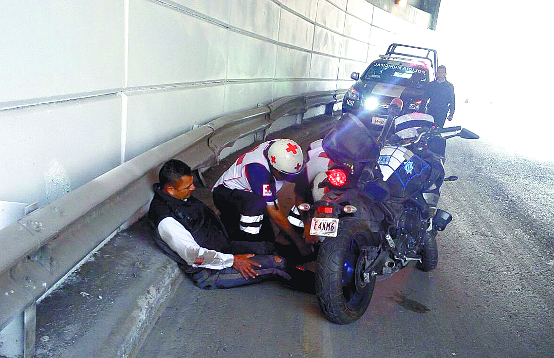 Un oficial de proximidad de la Policía de Tránsito municipal terminó hospitalizado luego de haber derrapado en el interior del paso a desnivel ubicado en el distribuidor vial Venustiano Carranza y Nazario Ortiz Garza, cuando un automovilista hizo que perdiera el control al querer rebasarlo.