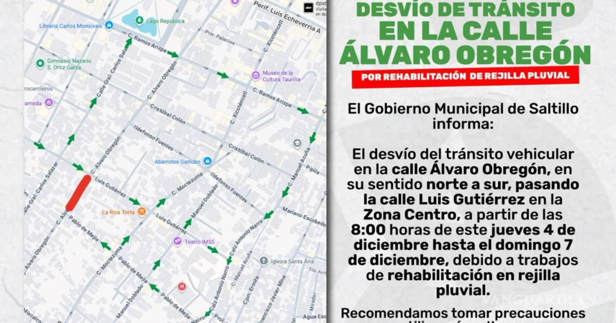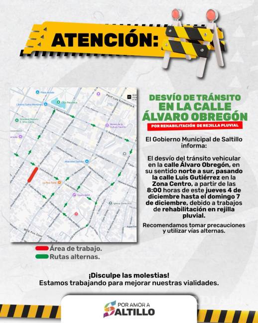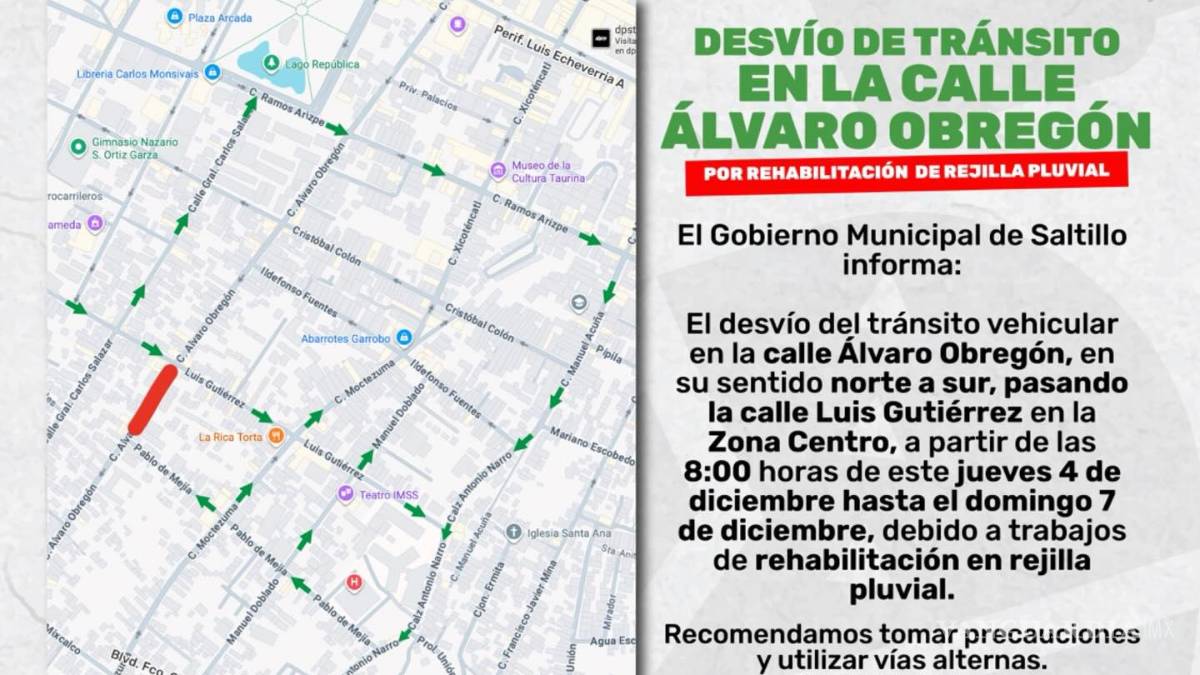 El Gobierno Municipal de Saltillo informó este jueves sobre el cierre parcial de la calle Álvaro Obregón, en la Zona Centro, debido a trabajos de rehabilitación en una rejilla pluvial.