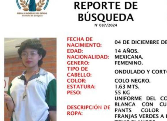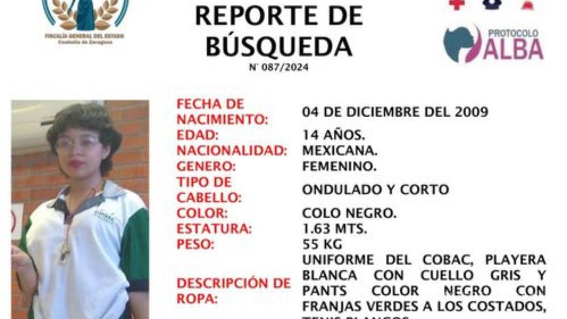 Frida, de 14 años, fue vista por última vez en la colonia Bellavista, en el municipio de Saltillo. De acuerdo con la información proporcionada, la joven mide 1.63 metros, pesa aproximadamente 55 kilos y tiene el cabello corto y ondulado de color negro.