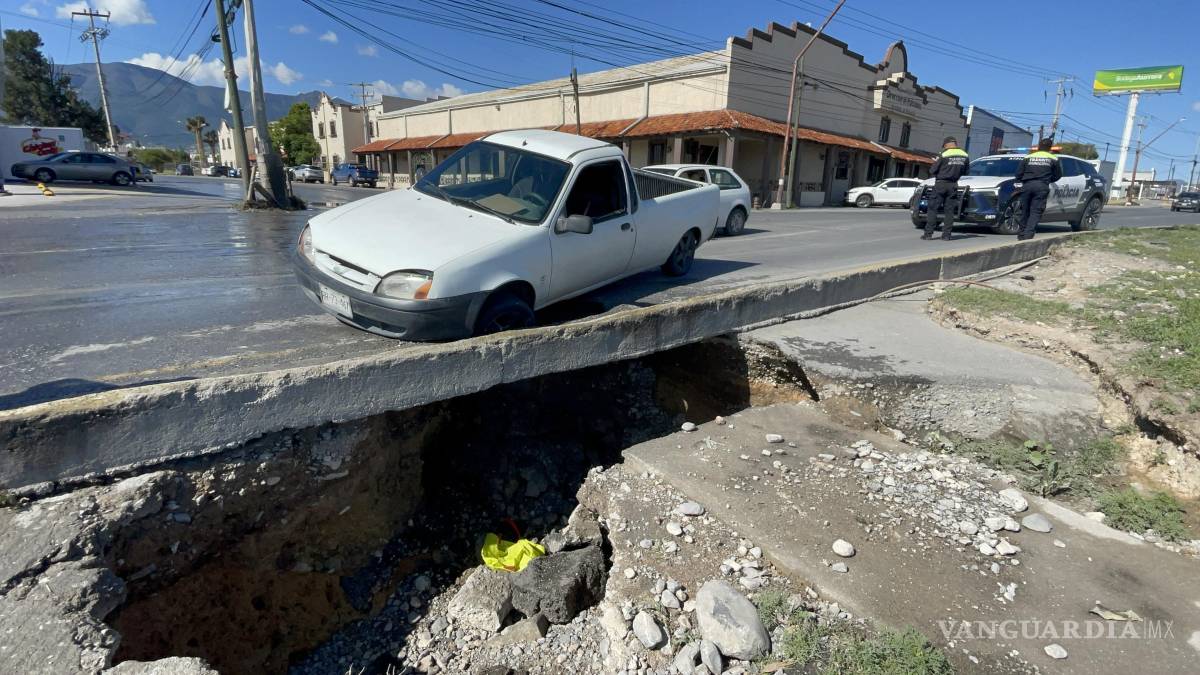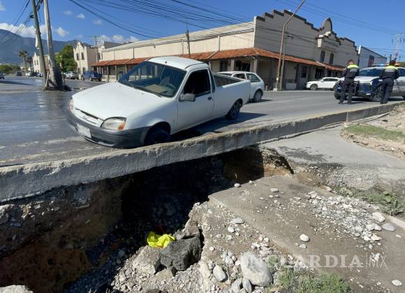 Una camioneta con dos personas a bordo cayó en un socavón formado en el pavimento, sin que los ocupantes resultaran con lesiones, en Saltillo. Sin embargo, el vehículo sí sufrió daños considerables.