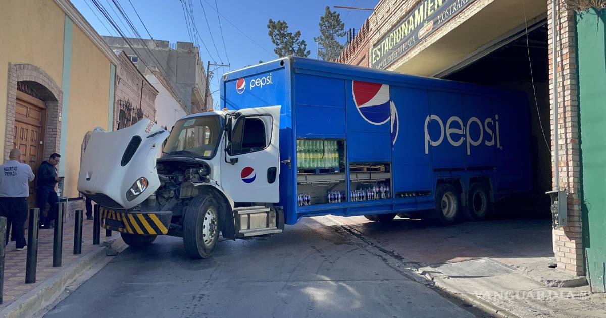 Calcula mal maniobra, se atora camión y provoca caos vial en el centro de Saltillo