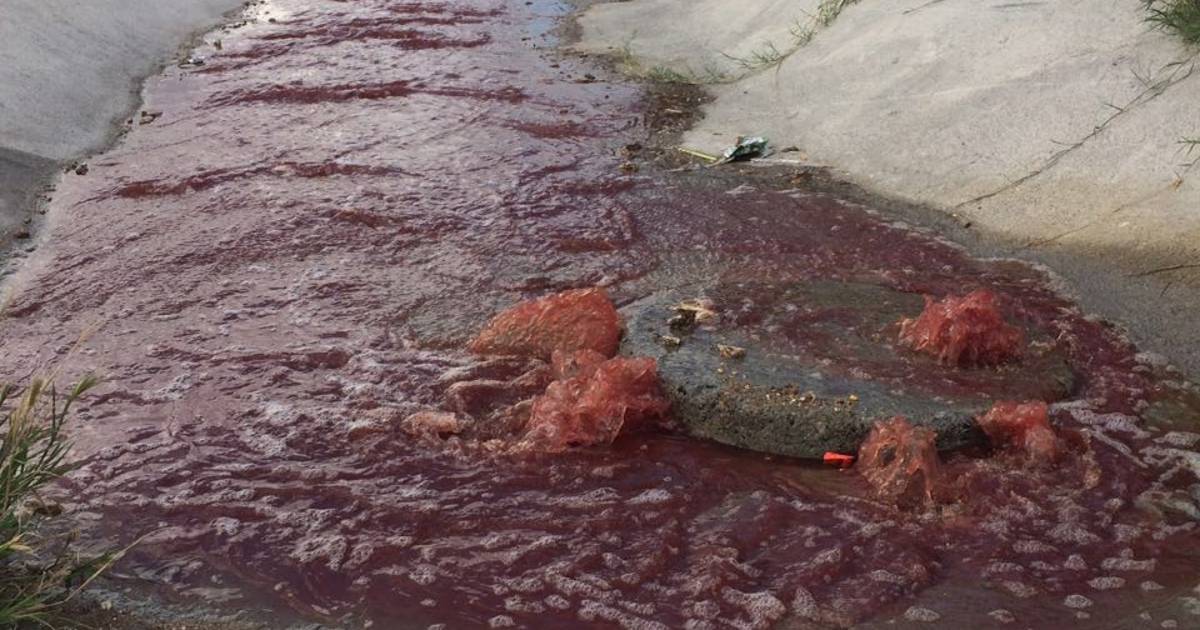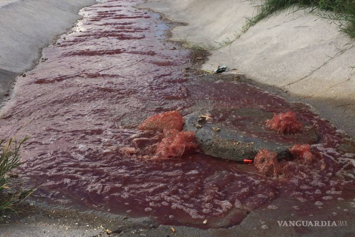 El bulevar Antonio Cárdenas se vio lleno de sangre, luego de que trabajadores vertieran sangre y viseras al drenaje pluvial, acto que tienen estrictamente prohibido