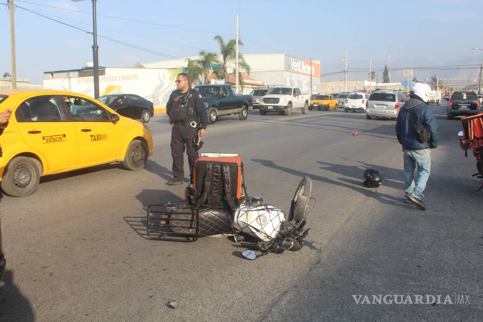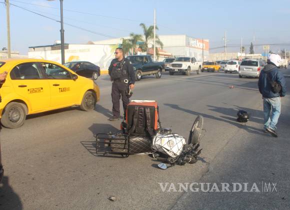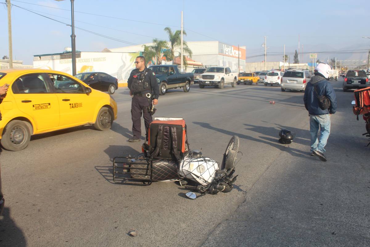 Un joven repartidor de comida rápida resultó con golpes y escoriaciones tras ser derribado de su motocicleta por una camioneta que le cerró el paso en la colonia La Herradura, en Saltillo.