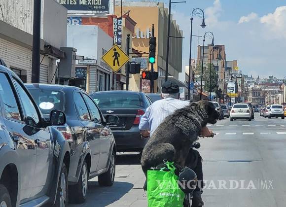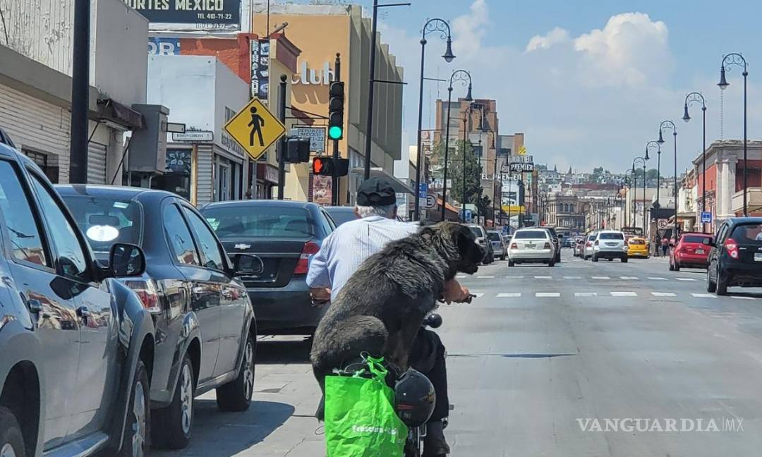 Usuarios de redes sociales se vieron sorprendidos al ver una peculiar escena en el Centro Histórico de Saltillo, un perrito andando en motocicleta con su dueño.