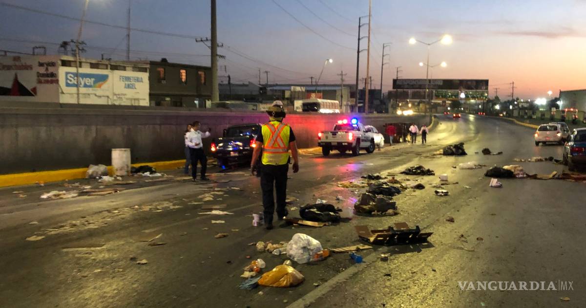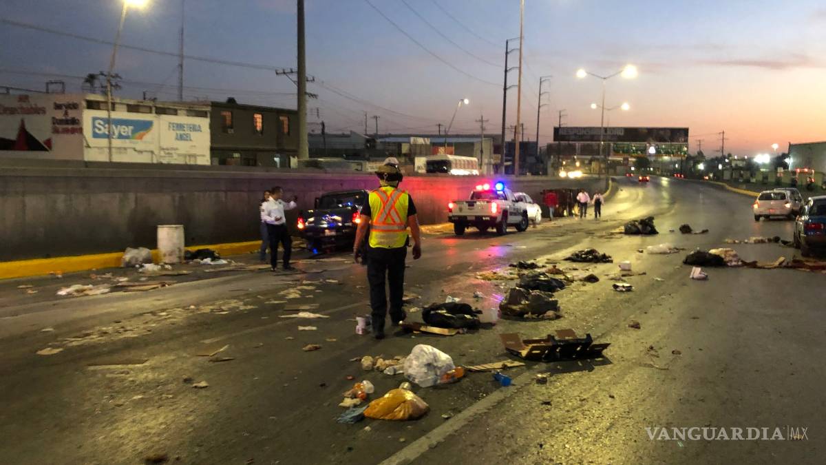Tras esto, el compacto brinco el camellón y aterrizó en el carril de incorporación de la lateral rumbo al norte, por donde iba una estaquitas que tras ser impactada brincó el camellón y terminó recostada sobre su costado derecho, soltando bolsas de basura sobre la vialidad.