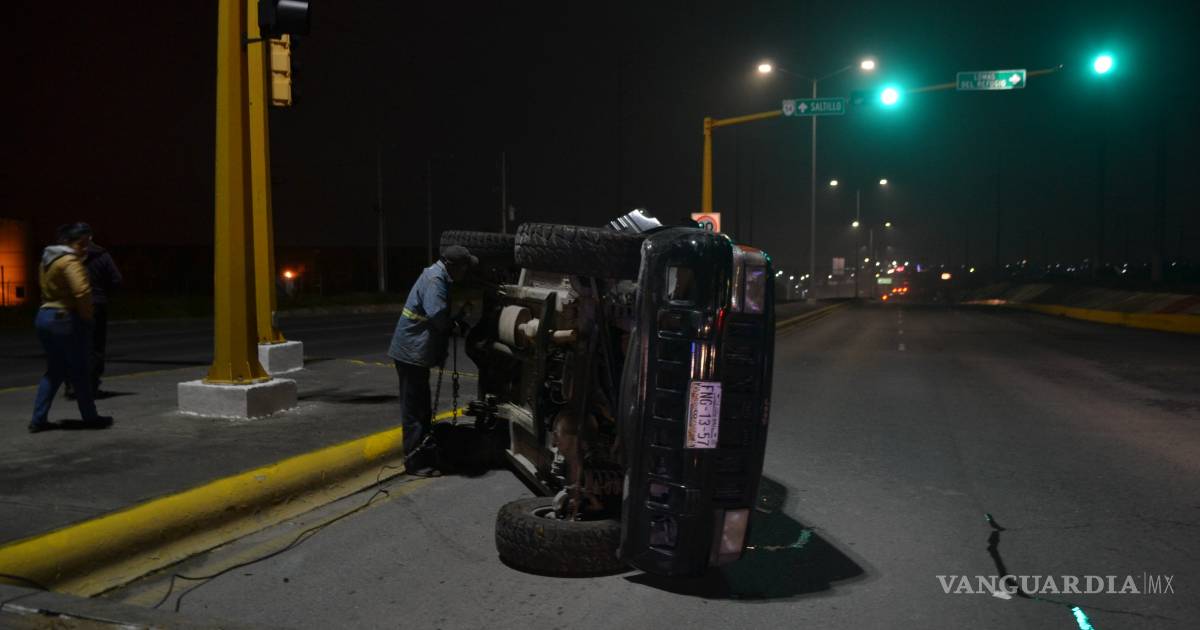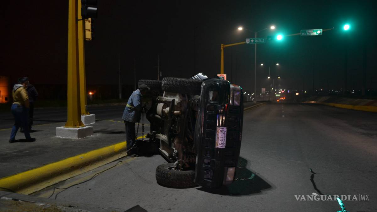 Cerca de casa vuelca por no calcular bien una vuelta; se lleva luminaria en bulevar de Saltillo