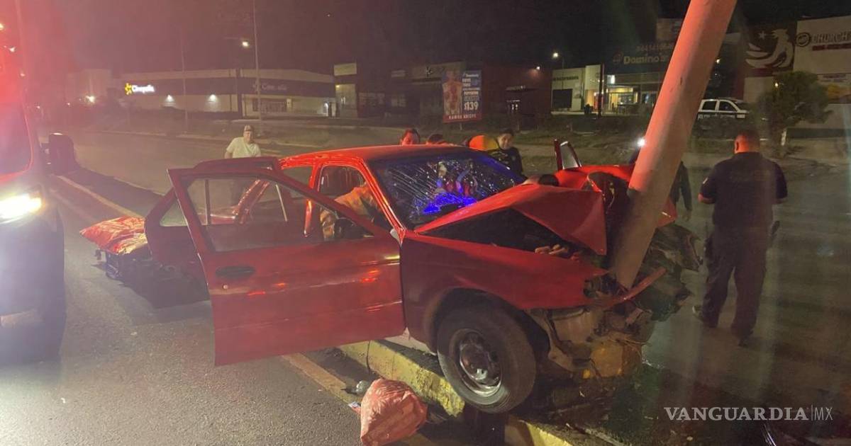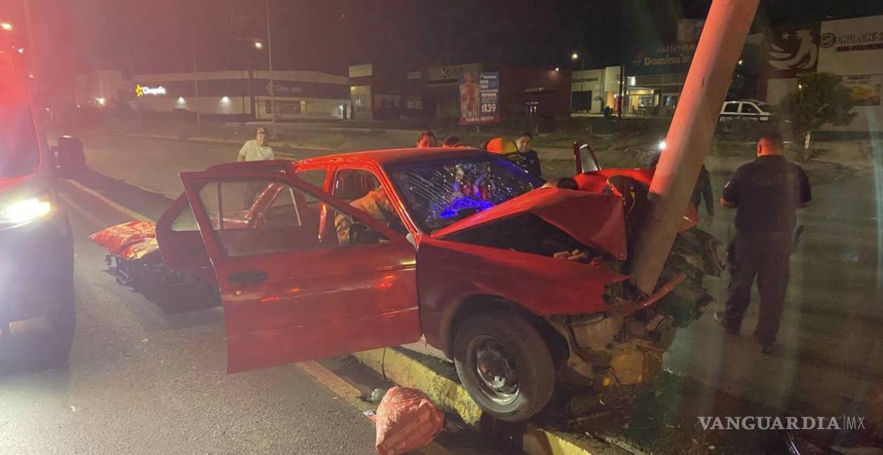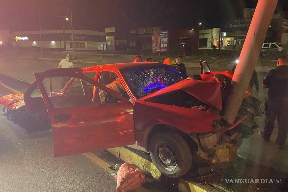 Choca contra luminaria en Ramos Arizpe y queda prensado; compañero resulta herido
