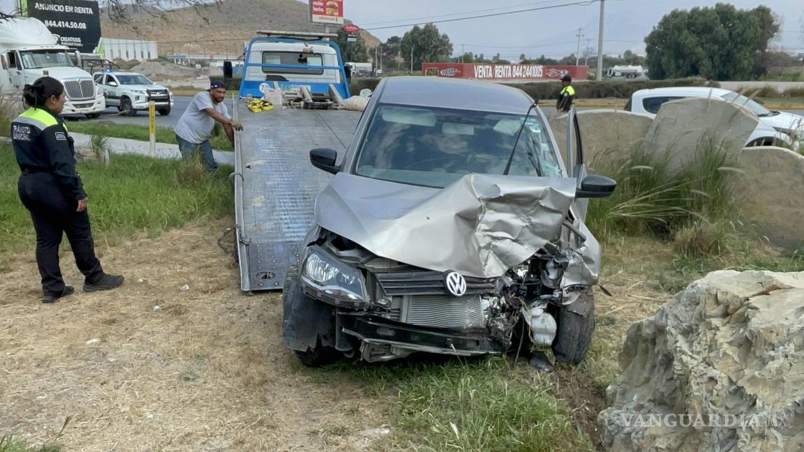 Contra una de las rocas que adornan la entrada de la ciudad de Saltillo terminó un automovilista al perder el control de su vehículo, luego de percatarse de que un tráiler realizaba la misma maniobra desde el carril contiguo.