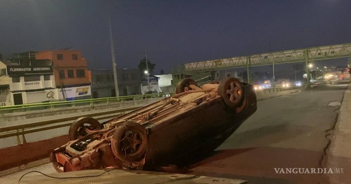 Choca y vuelca al sur de Saltillo; ambos conductores alegan semáforo en verde