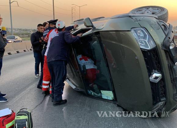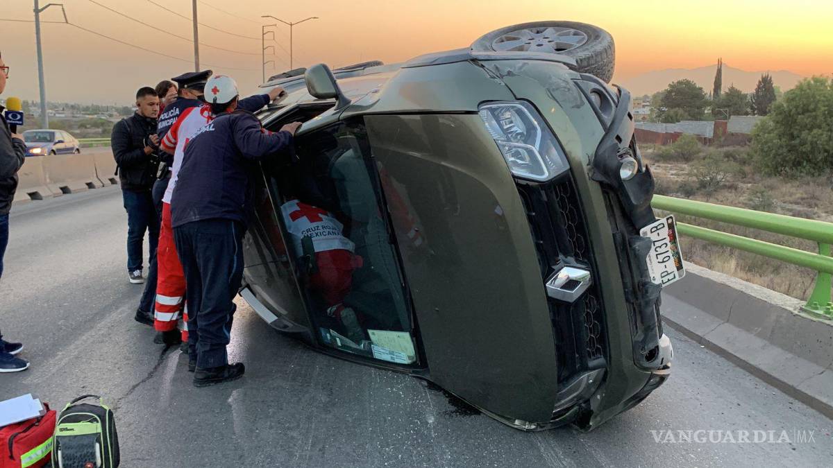 Choca y vuelca sobre puente de Periférico en Saltillo, tráfico se ve detenido tras accidente