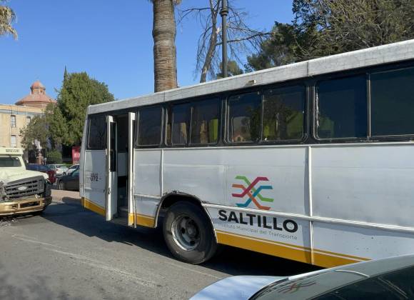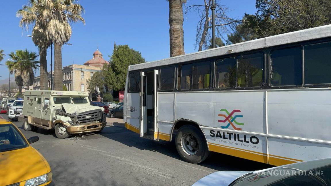 Choque entre camión de valores y transporte público causa caos vehicular en el centro de Saltillo