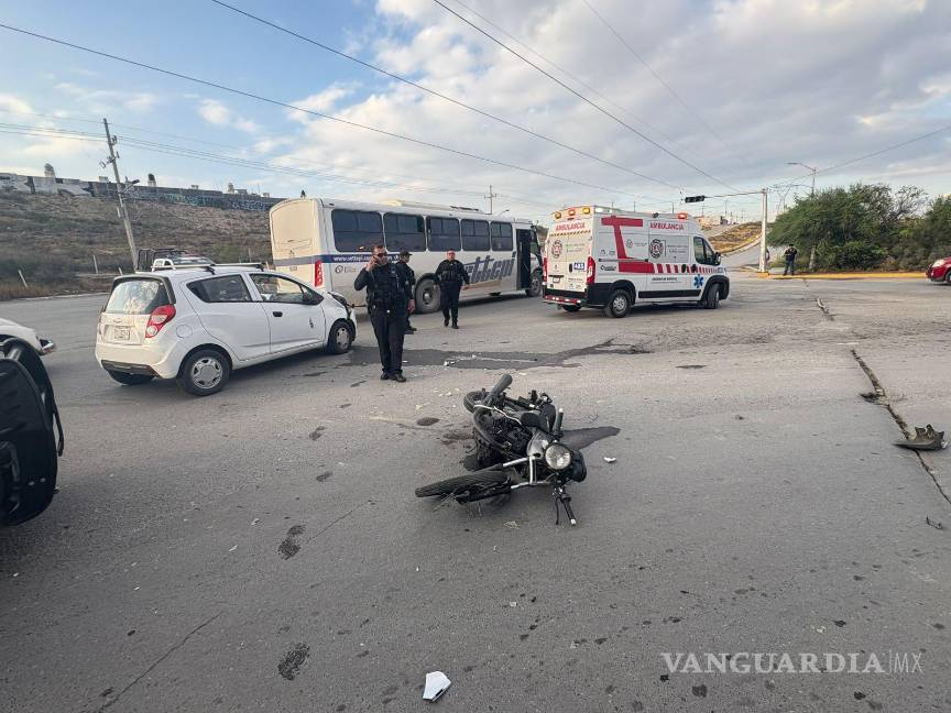 Choque entre moto y auto deja a pareja lesionada en Ramos Arizpe; ambos alegaron tener luz verde
