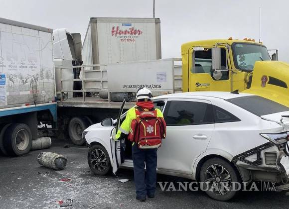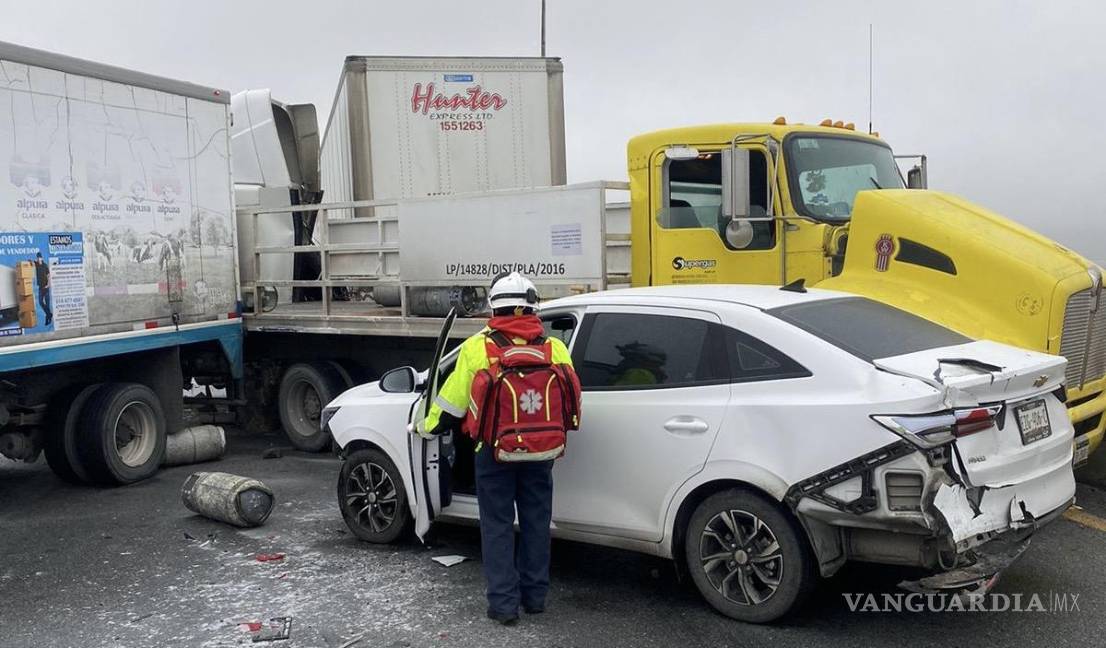 Un choque múltiple se registró alrededor de las 9:30 horas de este lunes en el puente del parque industrial Santa María, en Ramos Arizpe, involucrando a siete vehículos. Entre las unidades siniestradas se encontraban dos tráileres, un camión de gas LP y un camión de la empresa Alpura que transportaba leche.