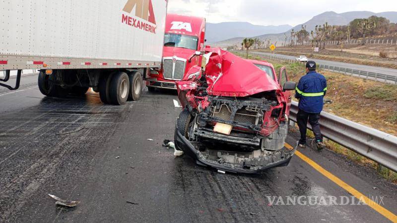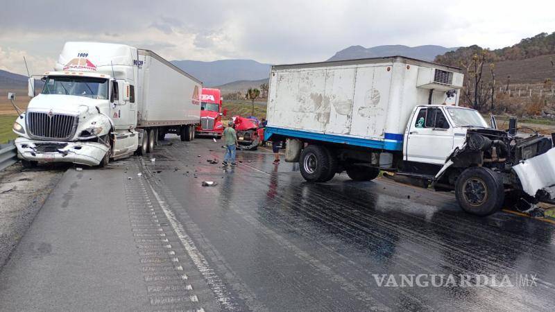 El percance ocurrió en el carril con dirección a Saltillo, cuando un tractocamión de la empresa TA chocó por alcance contra otro de la empresa Mexamerik. Este segundo tráiler, a su vez, impactó una camioneta que fue proyectada contra otro camión.