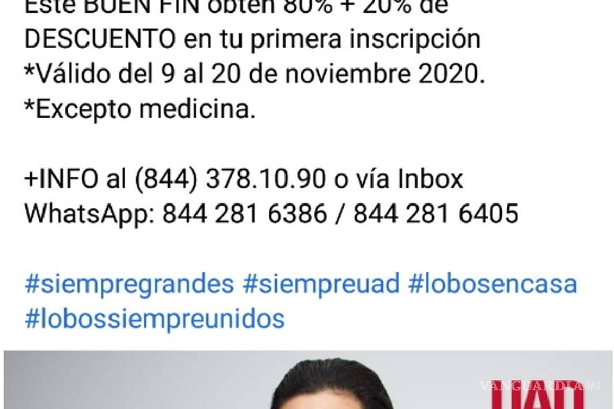 Asimismo en la Universidad Autónoma de Durango Campus Saltillo ofrece durante este buen fin un 80% más el 20% de descuento en la primera inscripción en todas sus licenciaturas excepto en medicina.
