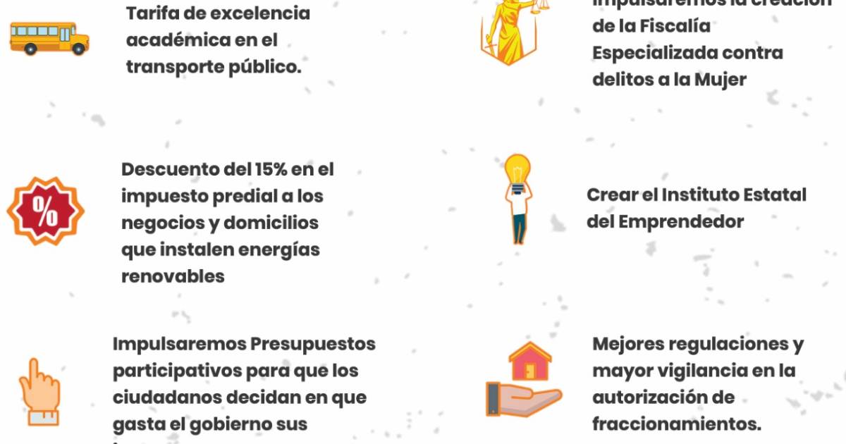 Entre estas propuestas se encuentran, por ejemplo, iniciativas para obtener un descuento del 15% en el impuesto predial para la ciudadanía, crear el Instituto Estatal del Emprendedor y ofrecer reconstrucción mamaria gratuita a las mujeres que padecieron cáncer, entre otras.