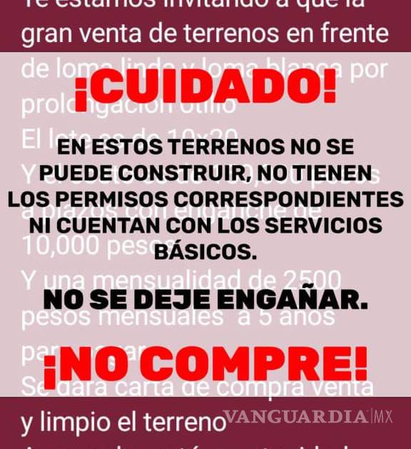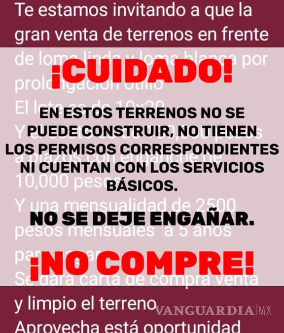 El Gobierno Municipal de Saltillo emitió una alerta a la ciudadanía ante la detección de la venta irregular de terrenos que se ofrecen en las inmediaciones de la prolongación Otilio González, frente a las colonias Loma Linda y Loma Blanca, principalmente a través de redes sociales y aplicaciones de mensajería instantánea.