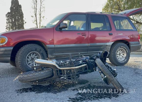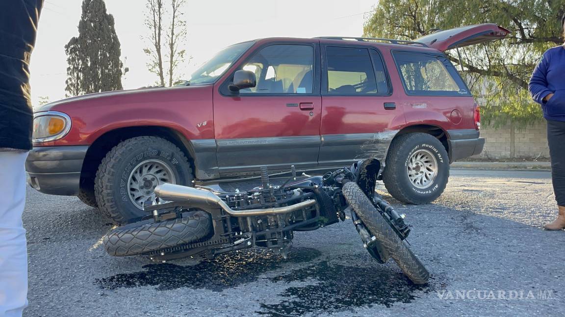 Da vuelta sin precaución y arrolla a motociclista en Saltillo; joven resulta lesionado