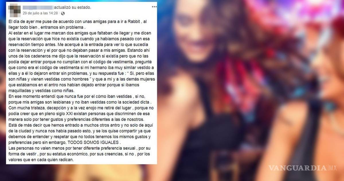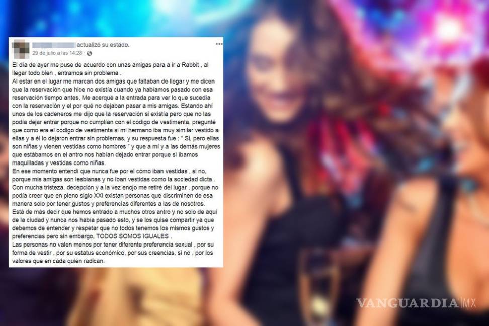 Los hechos sucedieron el pasado sábado al norte de Saltillo, cuando el cadenero del centro nocturno le señaló que no dejaría pasar a sus amigas por no cumplir con los códigos de vestimenta establecidos por el lugar, y por ir vestidas con aspecto masculino.