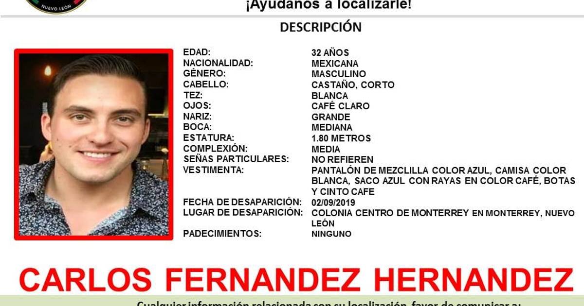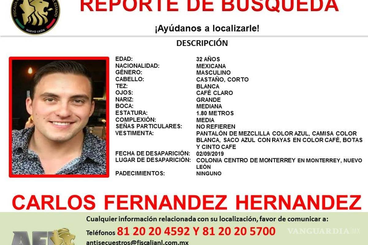 A través de redes sociales se conoció que Carlos Fernández Hernández, originario de la capital de Coahuila, fue visto por última vez el pasado 2 de septiembre de 2019 en la Zona Centro de Monterrey