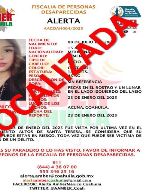 Por su parte, la Fiscalía de Personas Desaparecidas informó que, gracias a los trabajos de inteligencia y coordinación interinstitucional, la menor identificada como Janey Nicol Vaquera Pecina fue localizada el 24 de enero en la ciudad de Ramos Arizpe, Coahuila. Tras su localización, fue asegurada y puesta bajo el resguardo de la Procuraduría para Niños, Niñas y la Familia (Pronnif).
