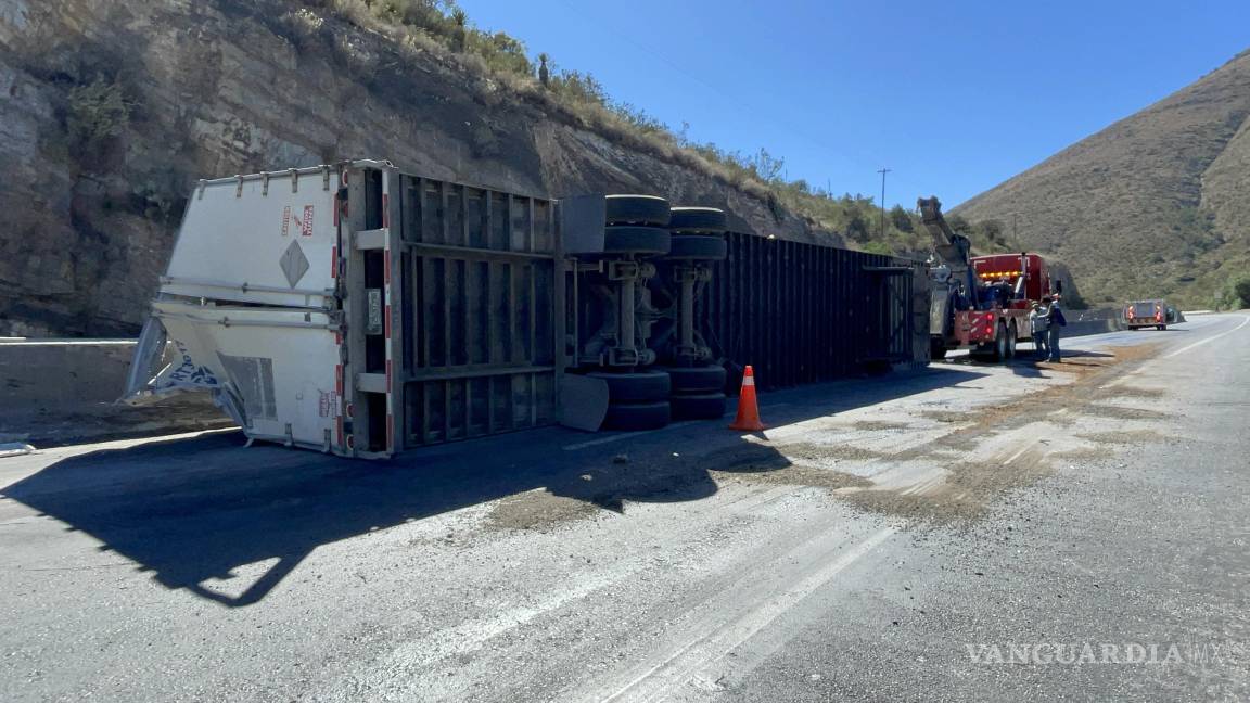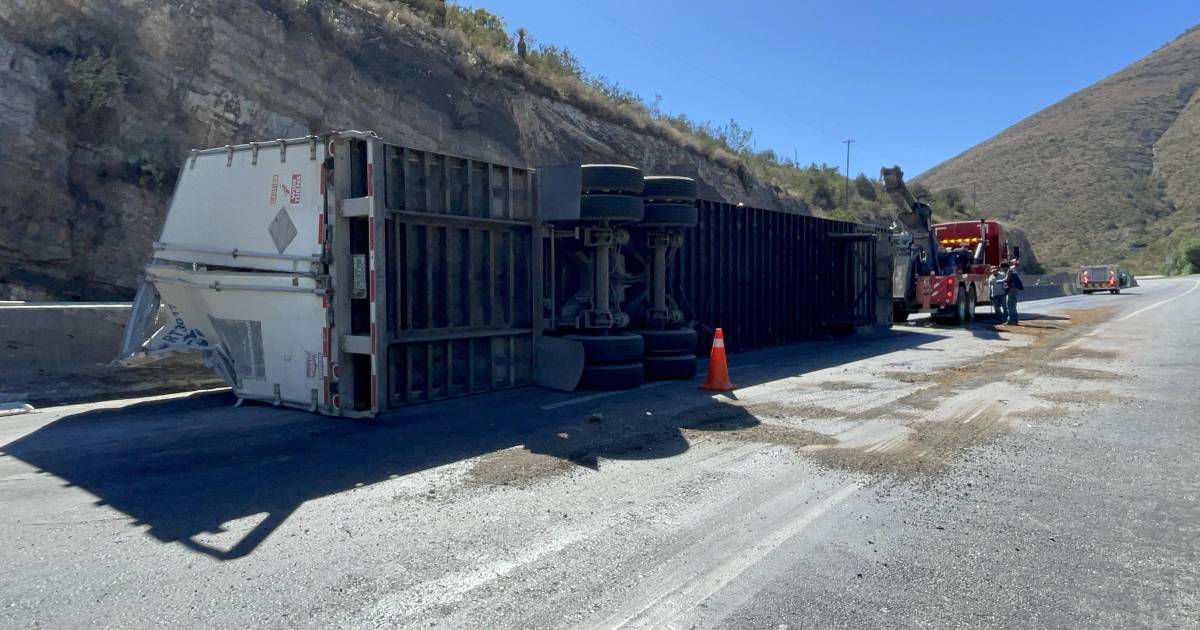 La vialidad en sentido a Saltillo también se vio afectada, ya que un tráiler de doble remolque que transportaba piso en tarimas sufrió la caída de parte de su carga, la cual se esparció sobre la autopista.