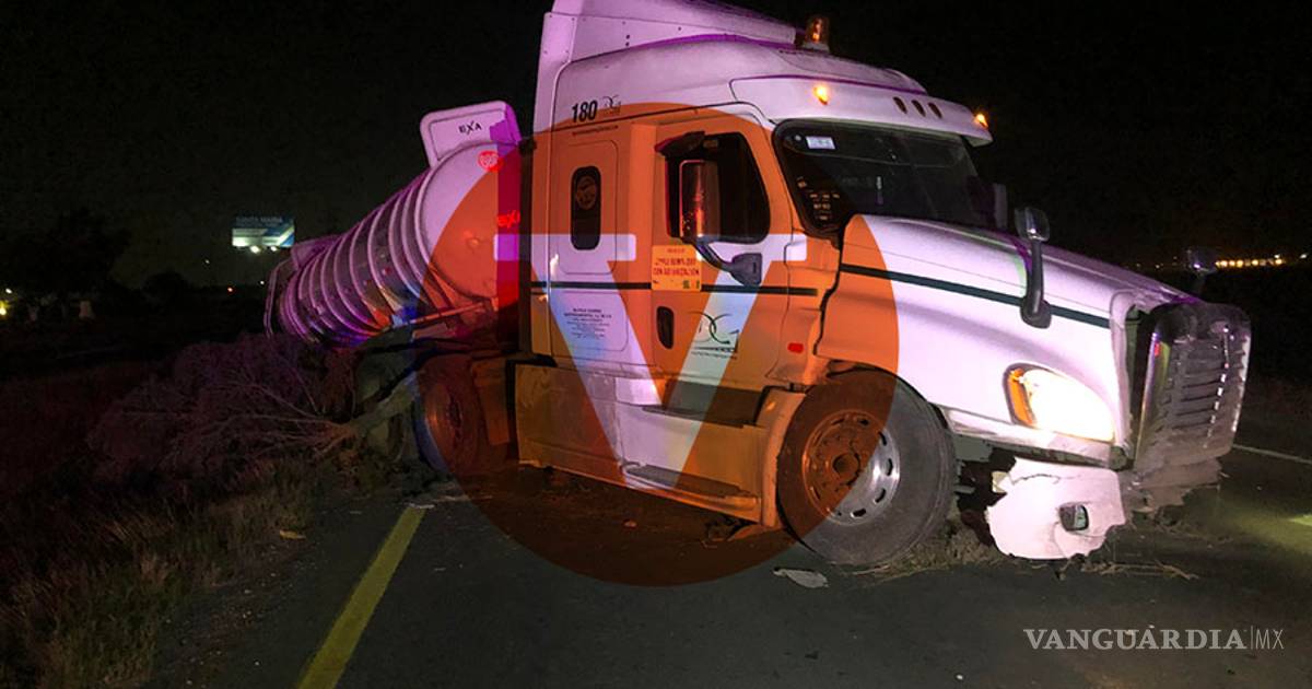 Saltillo.- Tras dormitar al volante el conductor de una pipa de material peligroso salió del camino en la carretera Saltillo-Monterrey y terminó sobré el carril contrario a donde circulaba, obstruyendo la carretera en dirección al vecino Estado, permaneciendo así por más de horas.