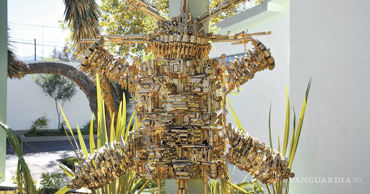 La escultura es dorada y no está hecha con materiales corrientes, está formada con pedazos de armas de fuego: revolver, pistolas, escopetas, fusiles, subfusiles, carabinas, que la gente llevó a canjear por dinero el año pasado a los módulos instalados por el Ejército en los principales municipios de Coahuila.
