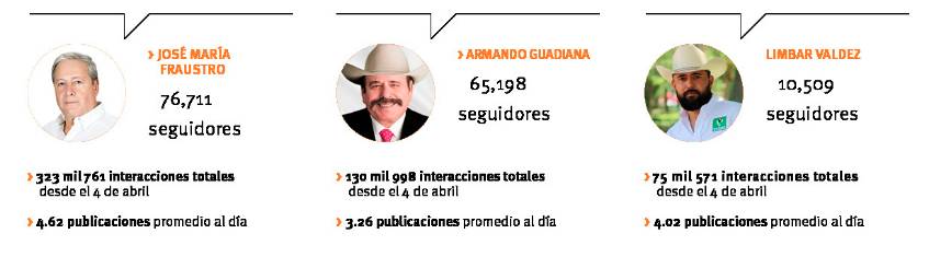 El candidato José María Fraustro Siller, del PRI-PRD, es quien domina Facebook en interacciones totales (reacciones, comentarios y compartidos), seguido de Armando Guadiana, de Morena, y Limbar Valdez, del PVEM