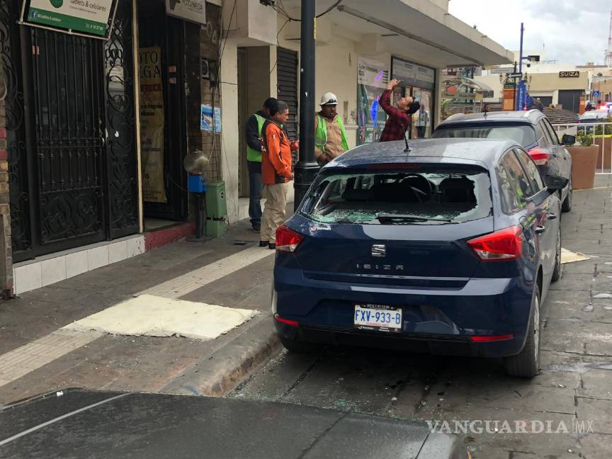 La estructura de un edificio en el centro de Saltillo se desprendió, causando daños en un vehículo