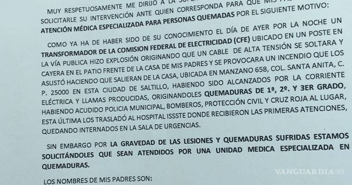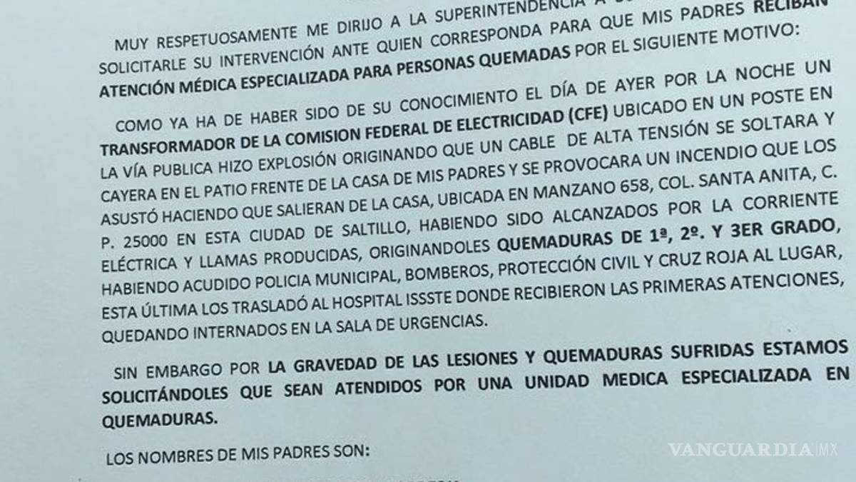 Familia de adultos pide que CFE de Saltillo se haga responsable por las quemaduras