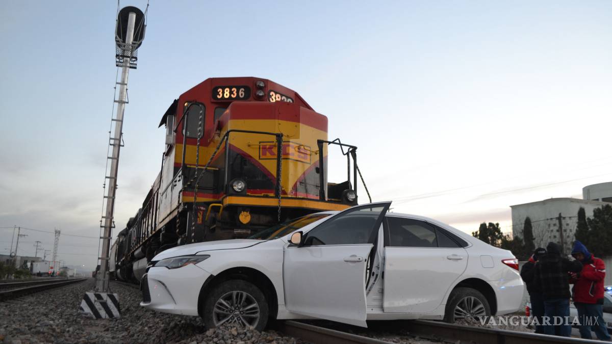 $!En Saltillo tres trabajadores a bordo de un vehículo son arrastrados 200 metros por un tren... y salen ilesos