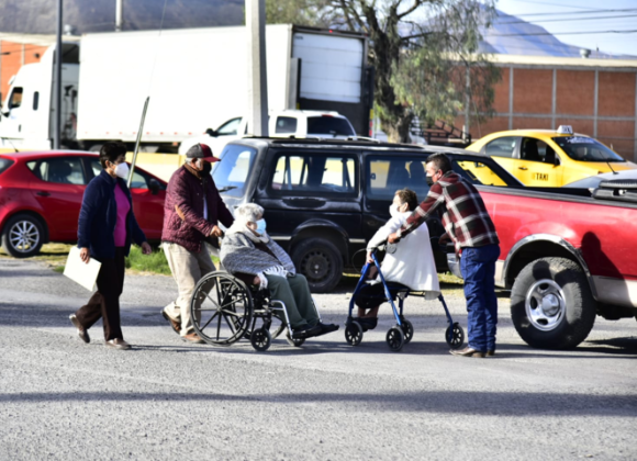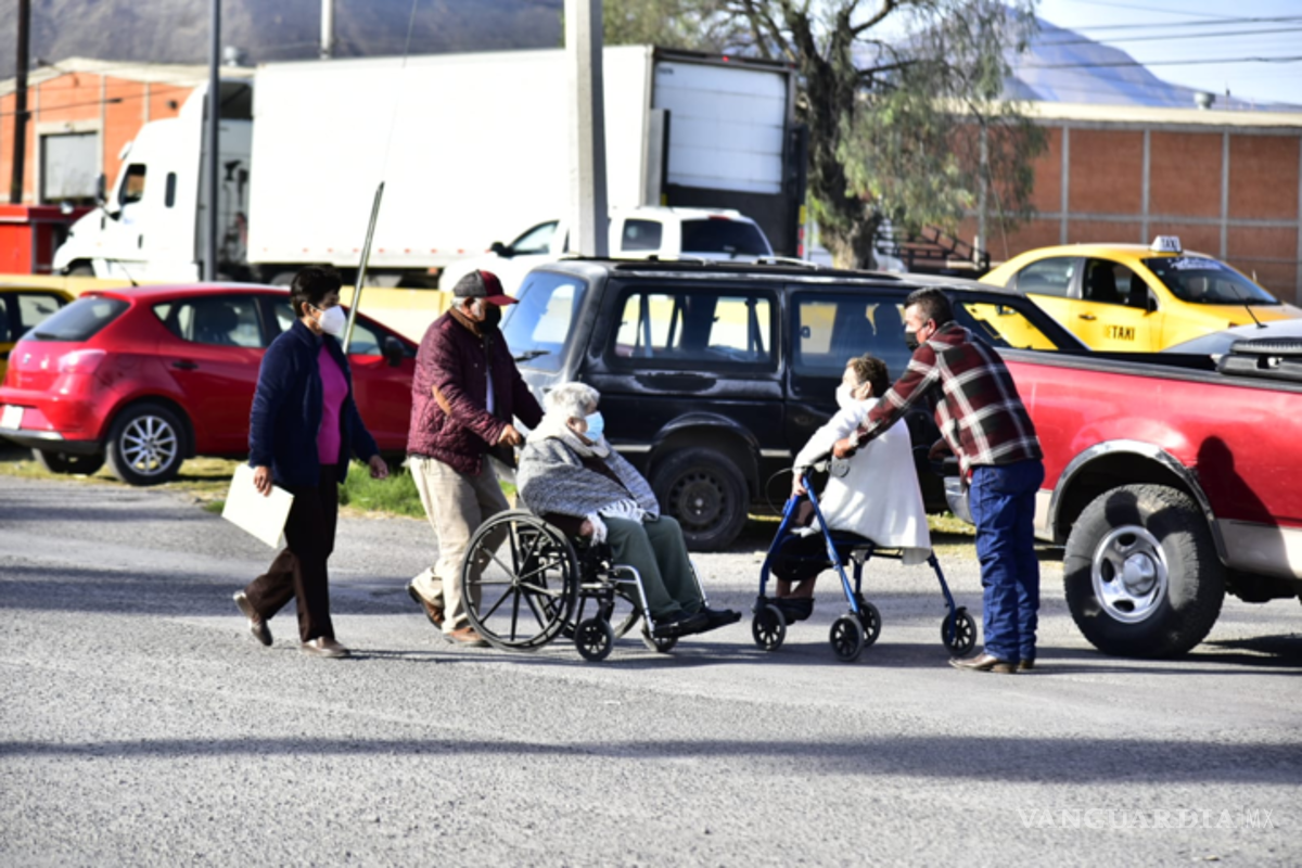 La ausencia de módulos de vacunación vehiculares para la aplicación del refuerzo de adultos mayores de Saltillo, dificulta el traslado de los abuelitos que apoyados de andaderas, bastones y sillas de ruedas deben hacer largas filas para aplicarse el biológico.