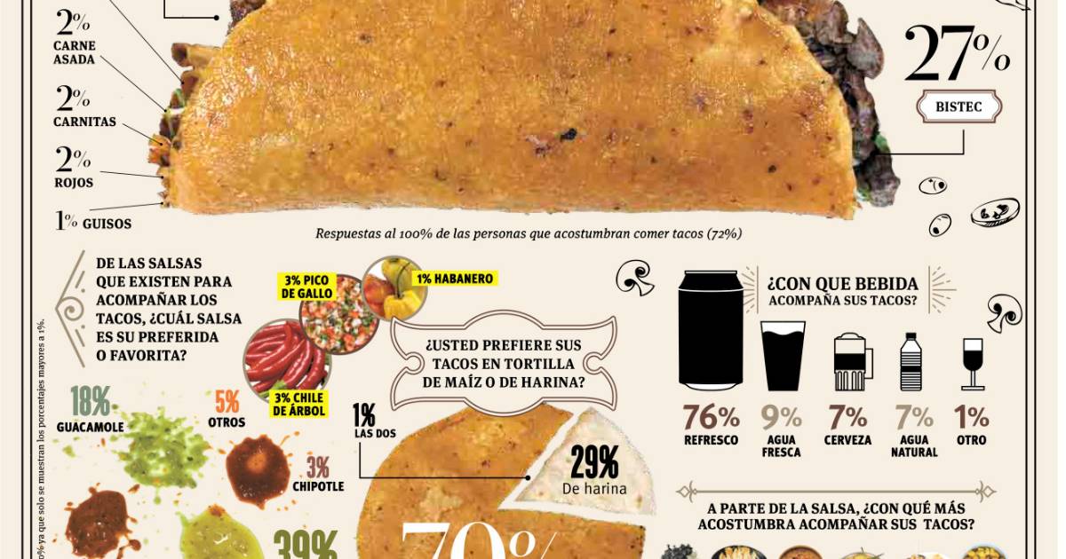 Para el acompañamiento, el 53 por ciento en definitiva dijo que lo único es la cebolla y el cilantro; el 13 por ciento optó por la cebolla asada, otro 13 por ciento por los frijoles charros, mientras que el 6 por ciento dijo que hay que agregarles queso; un 5 por ciento papa cocida o asada, y un 2 por ciento prefiere la piña como guarnición.