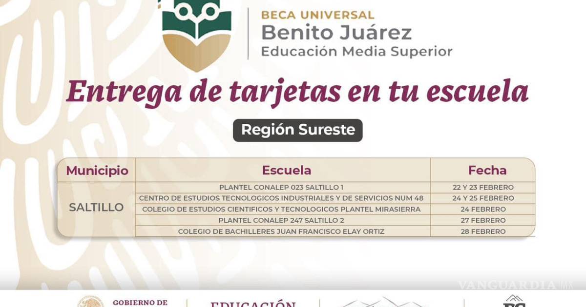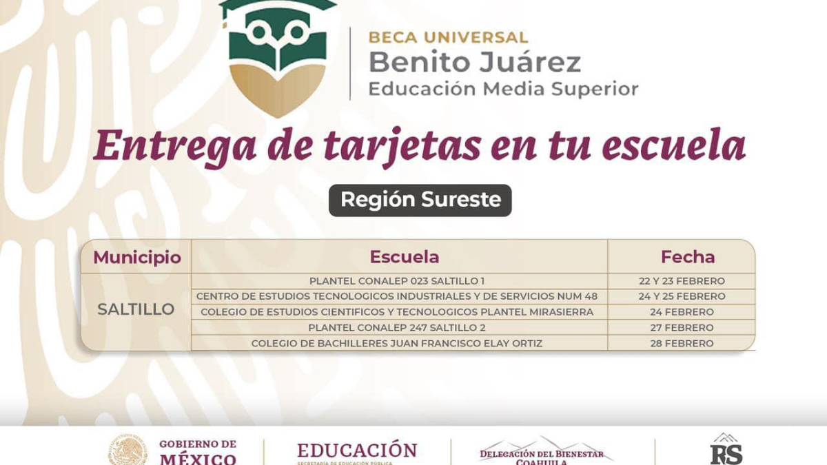 La Coordinación Nacional de Becas para el Bienestar "Benito Juárez” informó a través de un comunicado que la entrega de las tarjetas para el cobro de la subvención económica se realizará en planteles escolares de Saltillo.