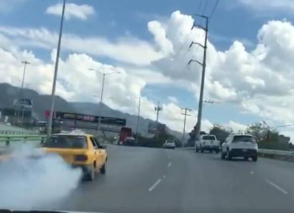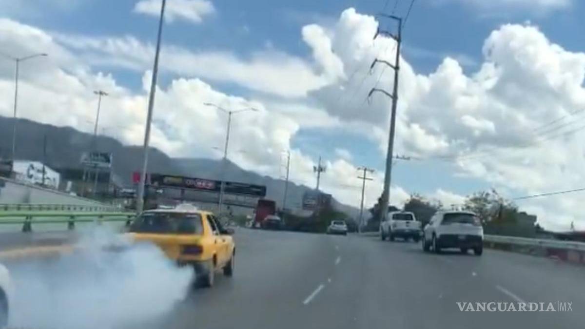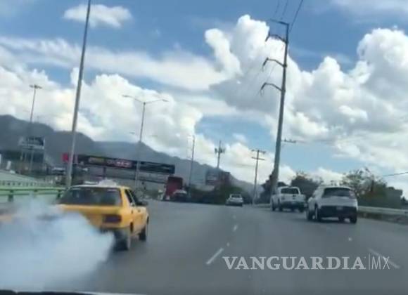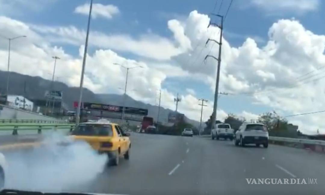 En las imágenes se puede ver al taxi circulando por el Periférico de Saltillo, mientras que deja una estela densa de humo.