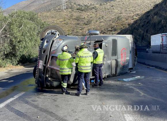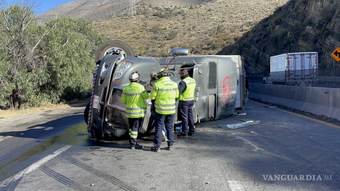 Exceso de velocidad provoca volcadura de tráiler en la carretera 57; operador sale ileso