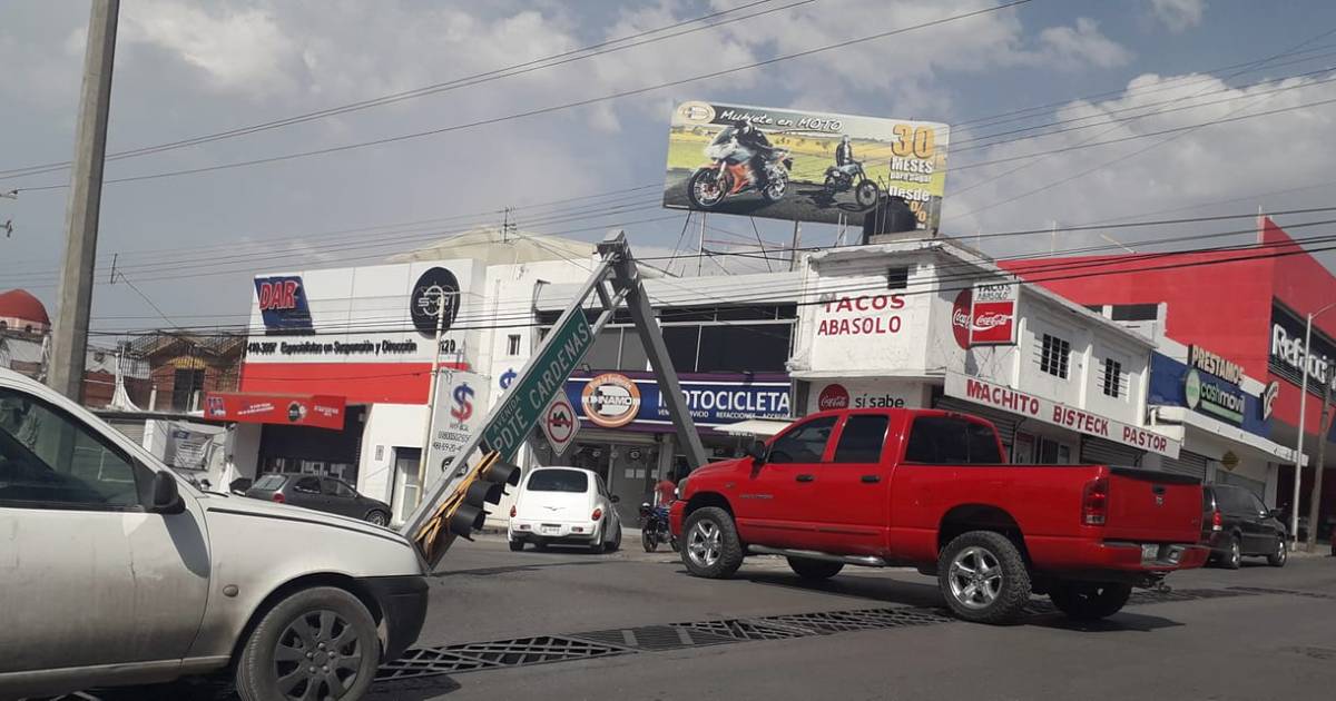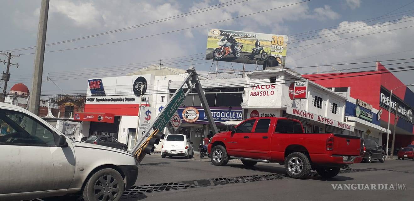 Las fuertes rachas de viento derribaron el semáforo ubicado en la avenida Presidente Cárdenas y calle Mariano Abasolo de Saltillo, lo que ocasionó que las autoridades municipales cerraran la vialidad durante la tarde de este martes.