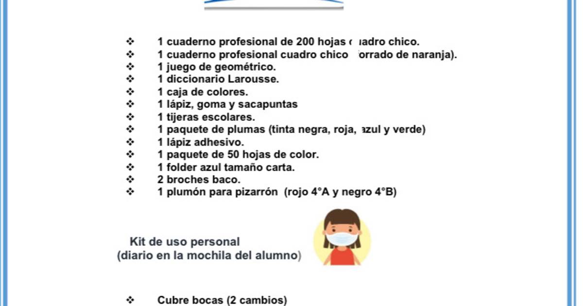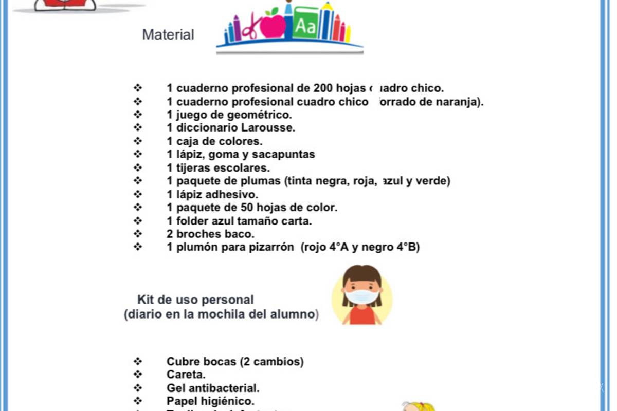 Aunque la Secretaría de Educación ha iniciado con la distribución de material antibacterial en escuelas públicas, listas de útiles escolares de algunas escuelas incluyen jabón líquido, cloro, limpiador de pisos, jergas, desinfectantes en aerosol, 20 cubrebocas, careta de uso personal y gel antibacterial.