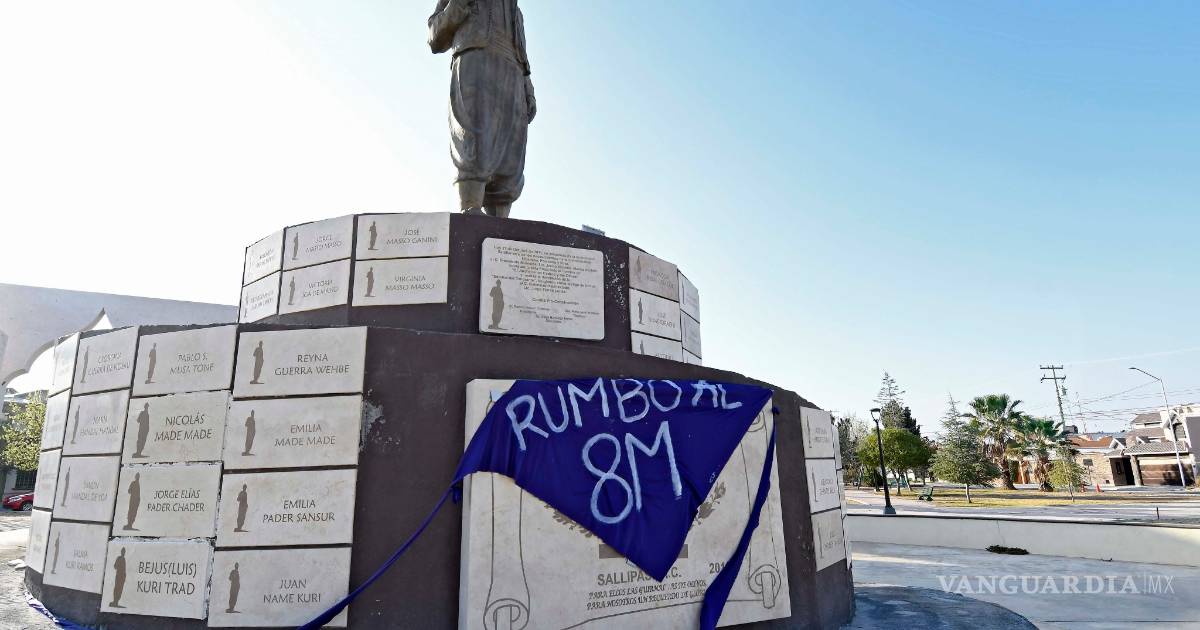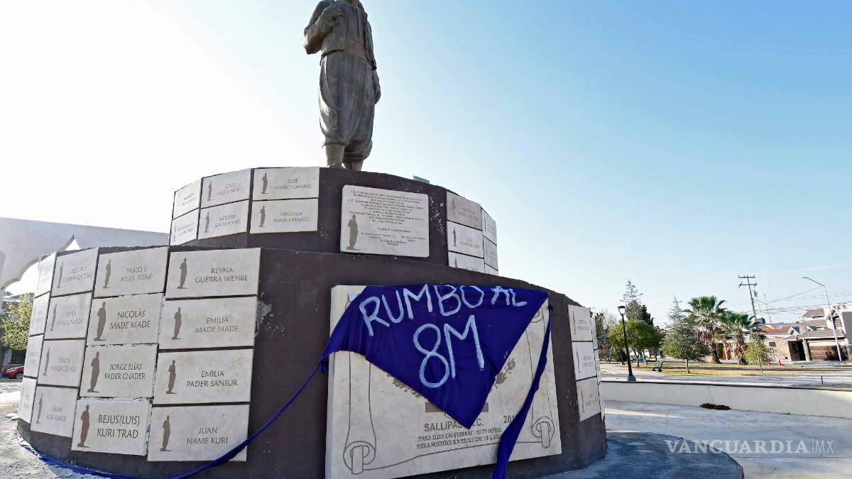 Este martes, uno de los monumentos que amanecieron con una pañoleta morada, símbolo de la lucha feminista, fue el Monumento de la Plaza del Emigrante Libanés al norte de Saltillo; sin embargo, estas insignias también fueron colocadas con la leyenda “Rumbo al 8M” por otras partes de la capital de Coahuila.