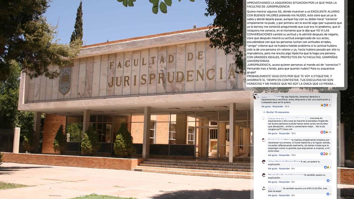 “Aprovechando la asquerosa situación por la que pasa la Facultad de Jurisprudencia quiero mostrar algunas SS (screen shots), donde muestran a un excelente alumno con buenos valores pidiendo mis nudes…” señala la alumna en su publicación que al momento de cerrar esta publicación había generado 80 comentario y se había compartido casi un centenar de veces.