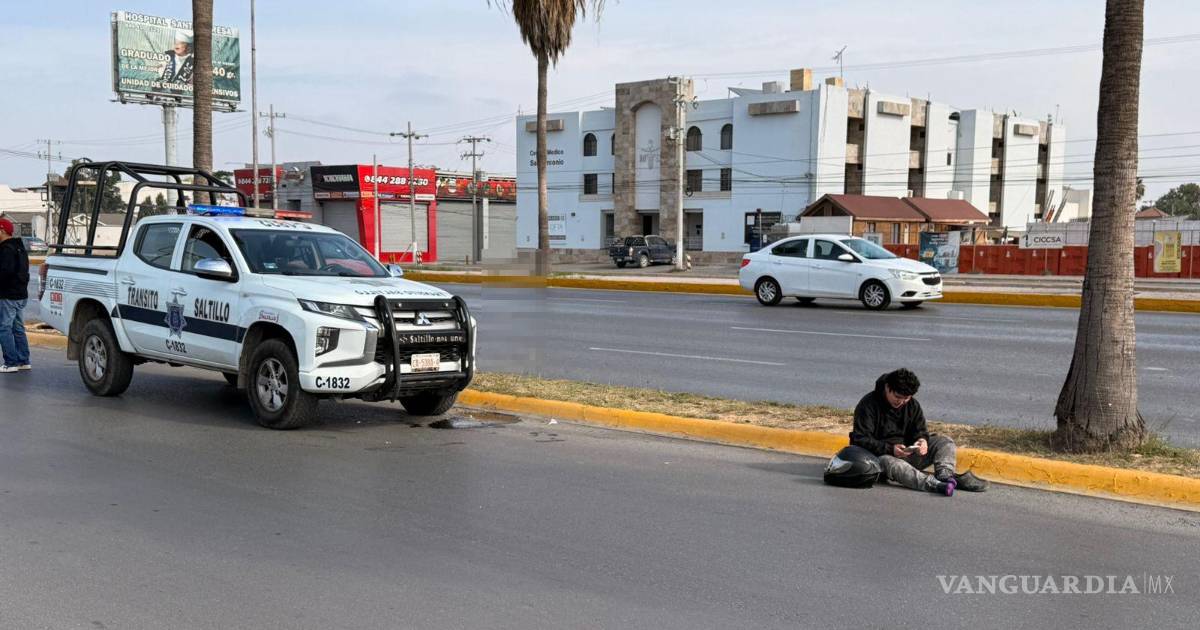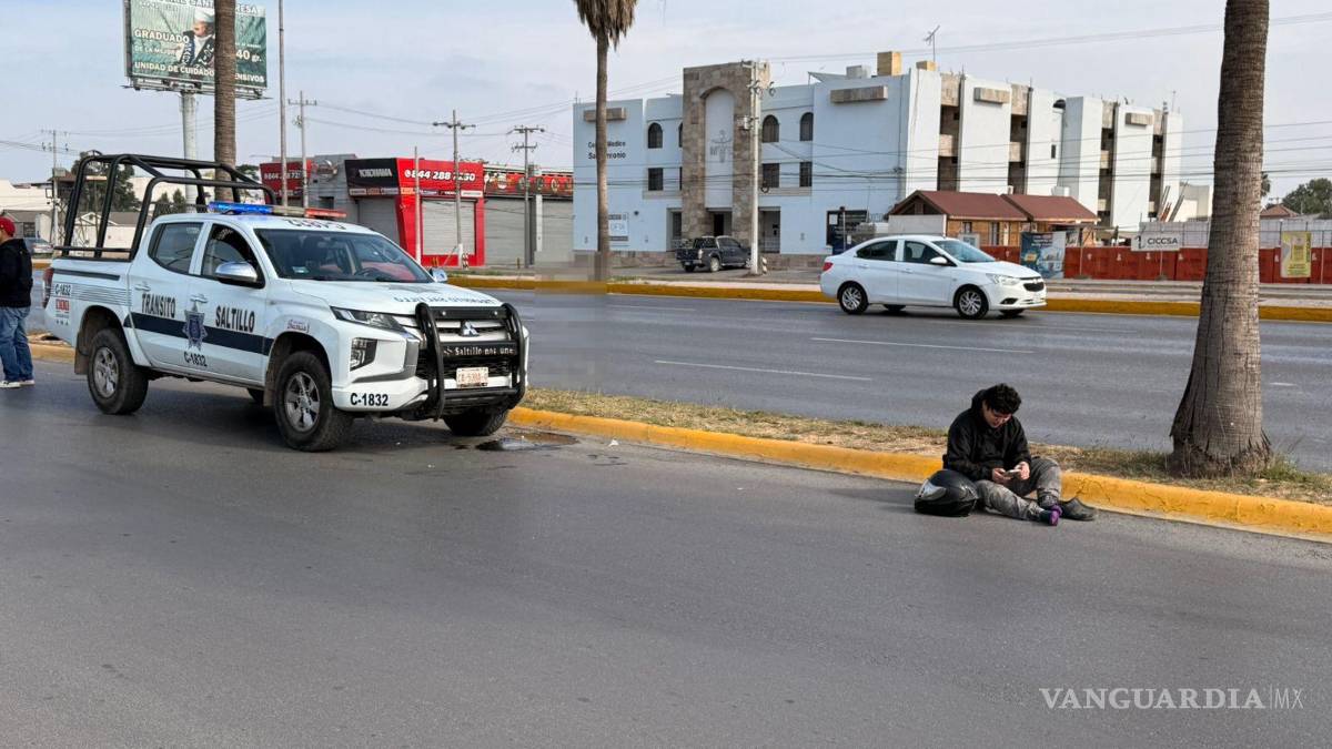 Las prisas por intentar rebasar a un vehículo en movimiento provocaron que una mujer motociclista chocara de costado y sufriera una caída, en Saltillo.