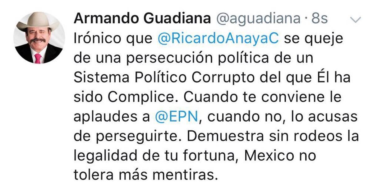 En su página de Twitter, Guadiana Tijerina señaló, que el candidato presidencial del Acción Nacional, ha actuado a conveniencia con el actual Gobierno de la República refiriéndose a su aporte para la aprobación de las reformas estructurales de este sexenio, y por otro lado, le lanzó una invitación para que compruebe la legalidad de sus ingresos y bienes, por los cuales se le ha señalado de lavado de dinero en la última semana.